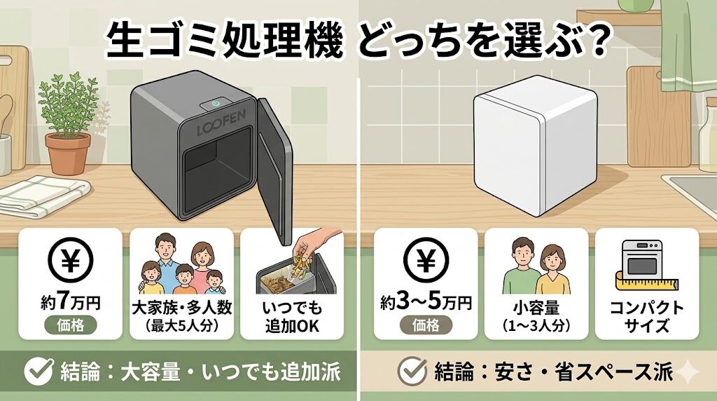 【結論】ルーフェンは「最大5人分の生ゴミをいつでも追加したい人」にはぴったり、ただ「安くて小さいサイズを求める人」には不向き